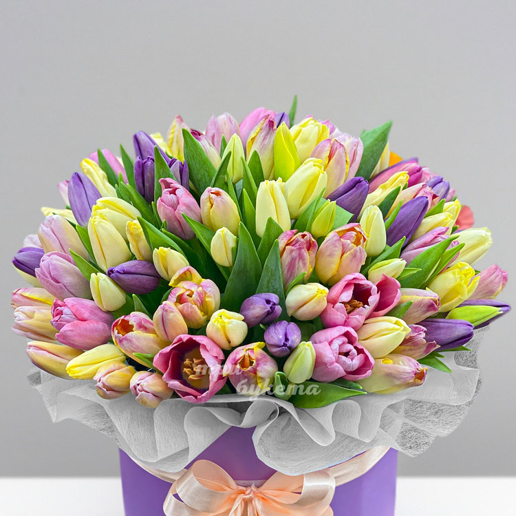 101 разноцветный тюльпан в коробке