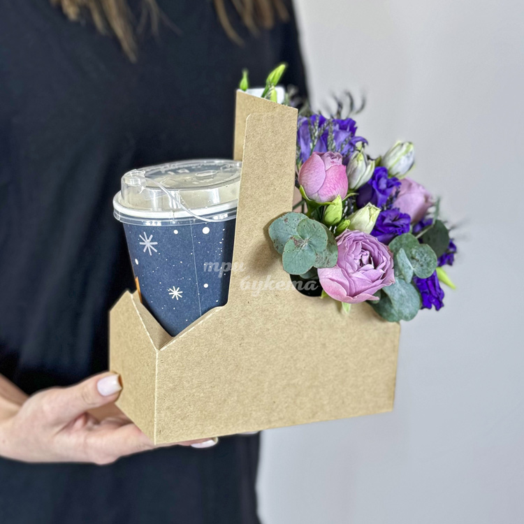 Бокс с кофе и фиолетовыми эустомами