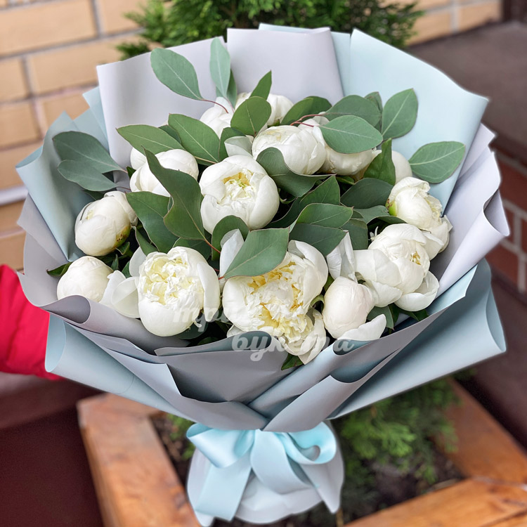 Букет из 15 пионов и эвкалипта