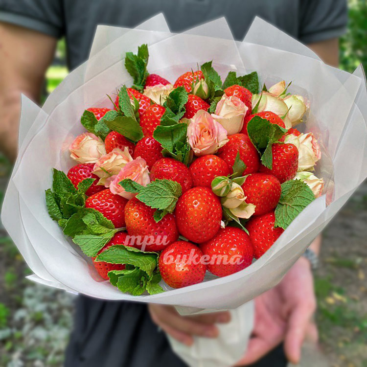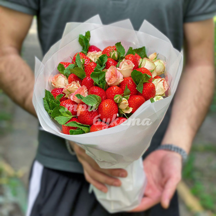 Букет из 25 ягод клубники и роз