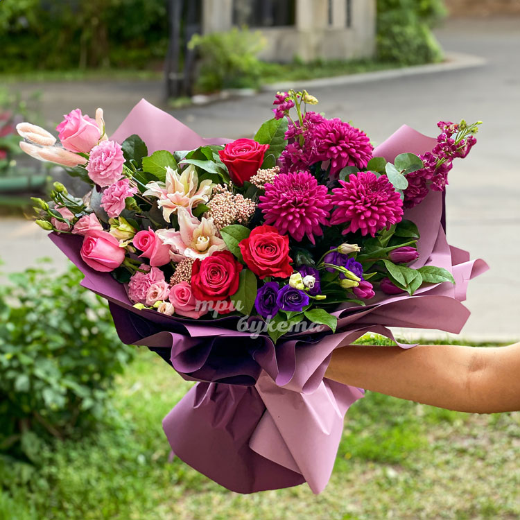 Букет розовых хризантем, роз и лилий