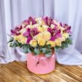 Коробка белых эустом и розовых гортензий