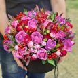 Коробка с эустомами, гвоздиками и розами