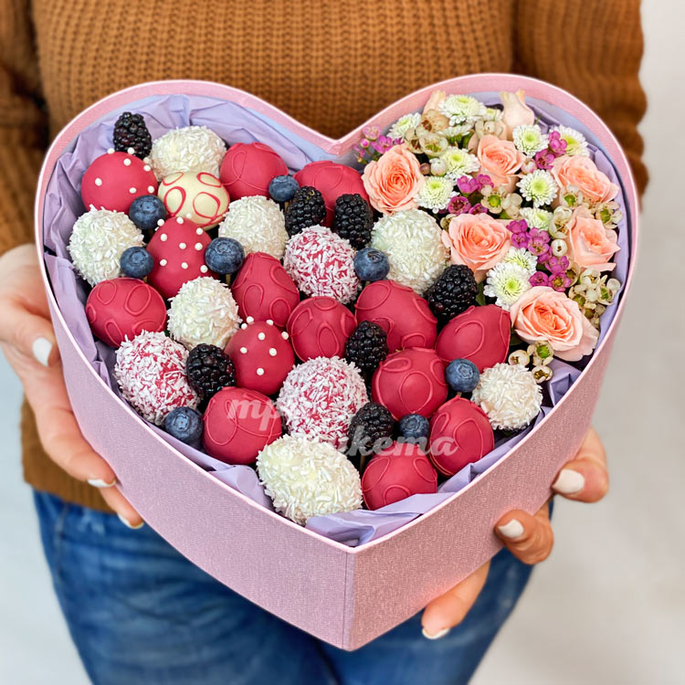 Коробка-сердце с клубникой в шоколаде и цветами