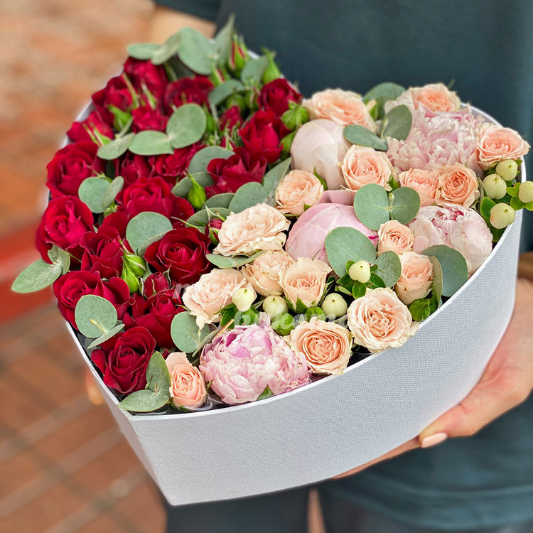 Коробка-сердце с куст. розами и пионами