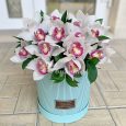 Коробка темно-розовых орхидей и красных роз