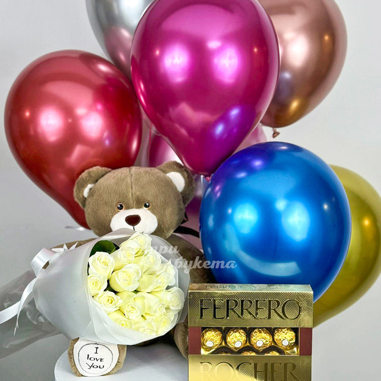 Набор из шариков, мягкой игрушки, конфет и 15 белых роз