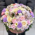 Ранункулюсы и кустовые розы в ящике